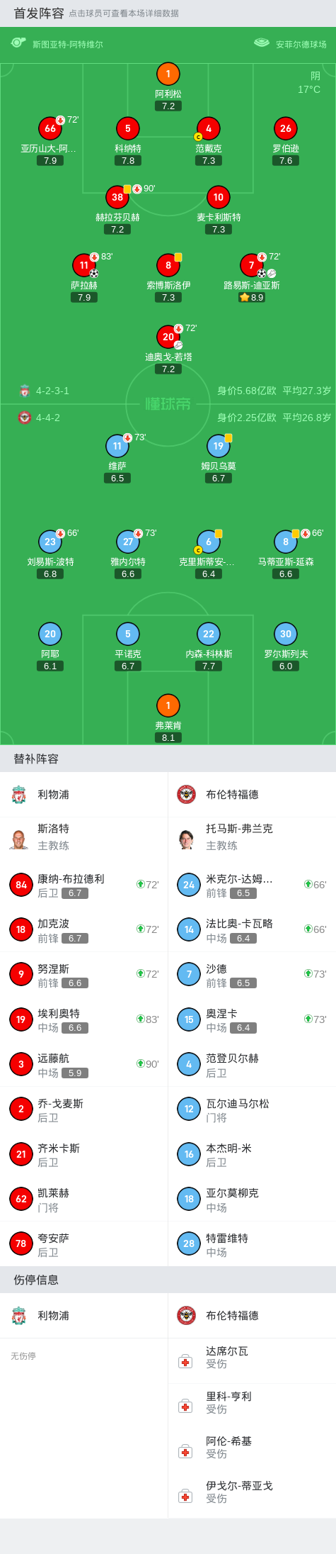 在比赛中还发生了一些紧张刺激的瞬间。例如,第46分钟,若塔在争顶时不慎打到内森-科林斯的面部,造成了一次伤停。另外,第55分钟,布伦特福德踢出战术角球,内森-科林斯的头球攻门被利物浦门将阿利松成功化解,展现出门线的稳固。
